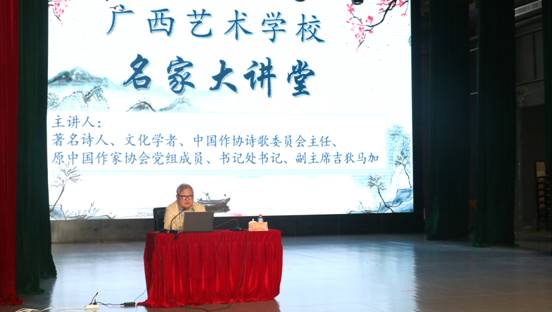 在讲座之前,大家共同欣赏了吉狄马加的代表性长诗作品《大河》,这部长诗作品被翻译成二十多种语言在世界各地发行,讲座中他分享了自己对这首长诗创作的感受和想法,旁征博引,纵横捭阖,娓娓道来,为听众展现了一幅生动宏阔的文学图景,既有现实的关照,又有浪漫唯美的想象,让我们深切的感受到诗人对我们民族、国家、世界的期望和想象,他同时还对我校在艺术人才培养,传播传承广西地方民族文化资源方面提出了希望和建议,特别是对全校师生长达60余年扎根壮乡培养艺术人才的嘉勉、期许,令人鼓舞、振奋。